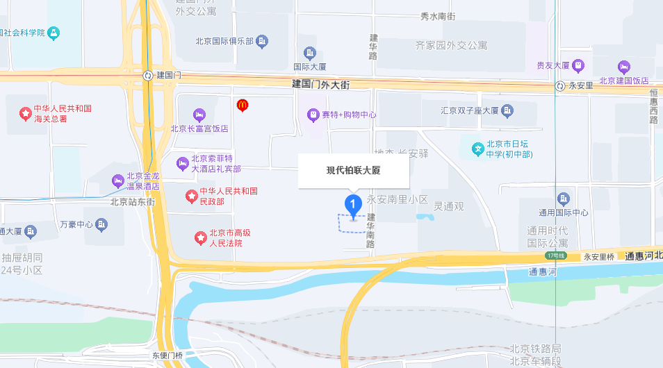 现代柏联大厦位于建国门外大街建华南路17号,东毗建华南路,北距东长安街200余米,西临赛特饭店,南靠成远大厦,地理位置得天独厚。大厦周边地区高档写字楼、酒店、商场云集。国际大厦、国际俱乐部、赛特购物中心、友谊商店、贵友商场等近在咫尺。